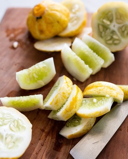 Dont be fooled by this heirloom cucumbers unusual shape. Use the pulp and rind in culinary and baking. Lemon - Organic Cucumber Seed.